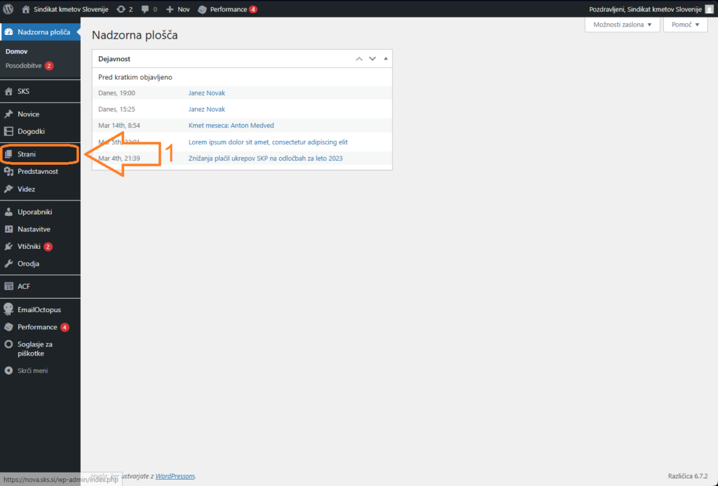 2. Odpre se vam nadzorna plošča za urejanje spletne strani. V levi orodni vrstici kliknete gumb Strani (1).