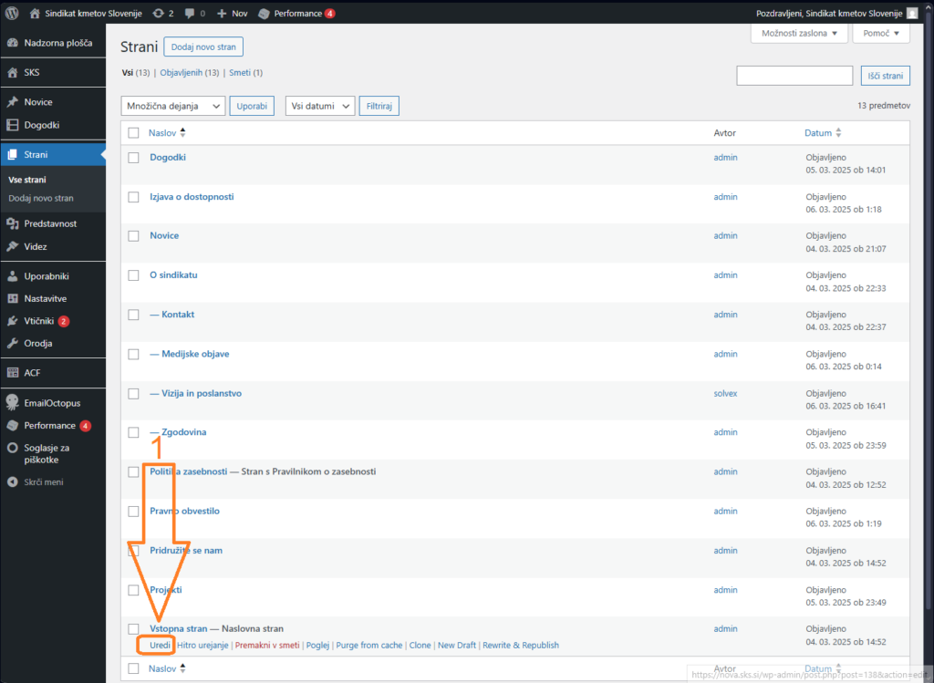 3. Prikaže se seznam strani. Na seznamu poiščite stran z imenom Vstopna stran in kliknite gumb Uredi (1). Sedaj nadaljujte postopek na koraku št. 7.
