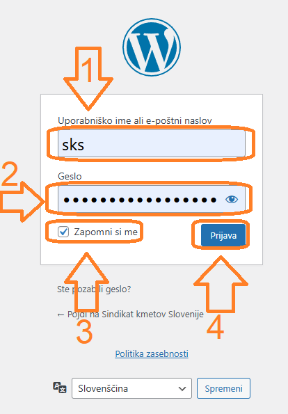 1. Navigirajte na spletni naslov https://www.nova.sks.si/skrivni-admin in vnesite prijavne podatke, ki ste jih prejeli po e-pošti: Uporabniško ime (1), Geslo (2), obkljukajte Zapomni si me (3), da se vam ne bo treba vedno znova prijavljati in kliknite gumb Prijava (4). Postopek nadaljujete s korakom št. 4.