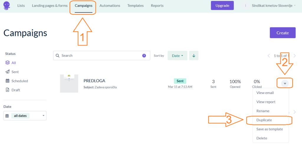 2. Kliknete na zavihek campaigns (1) in skopirate obstoječo predlogo s klikom na puščico (2) na desni strani in nato na gumb duplicate (3).