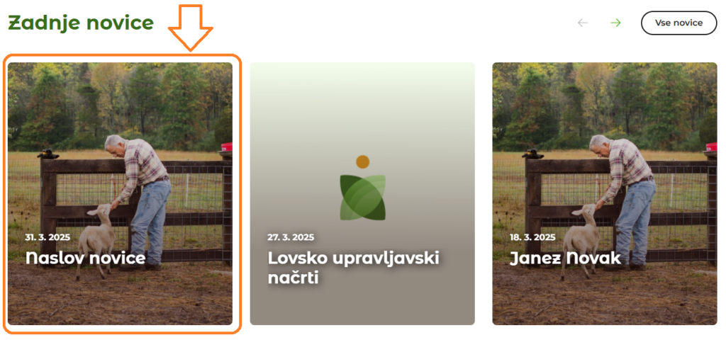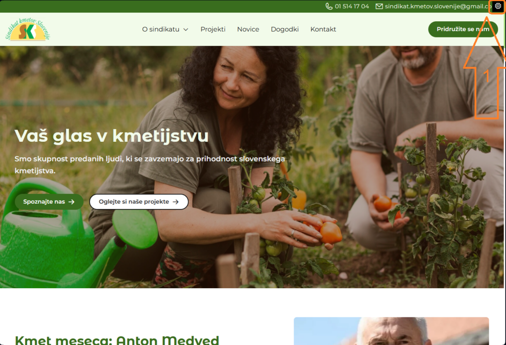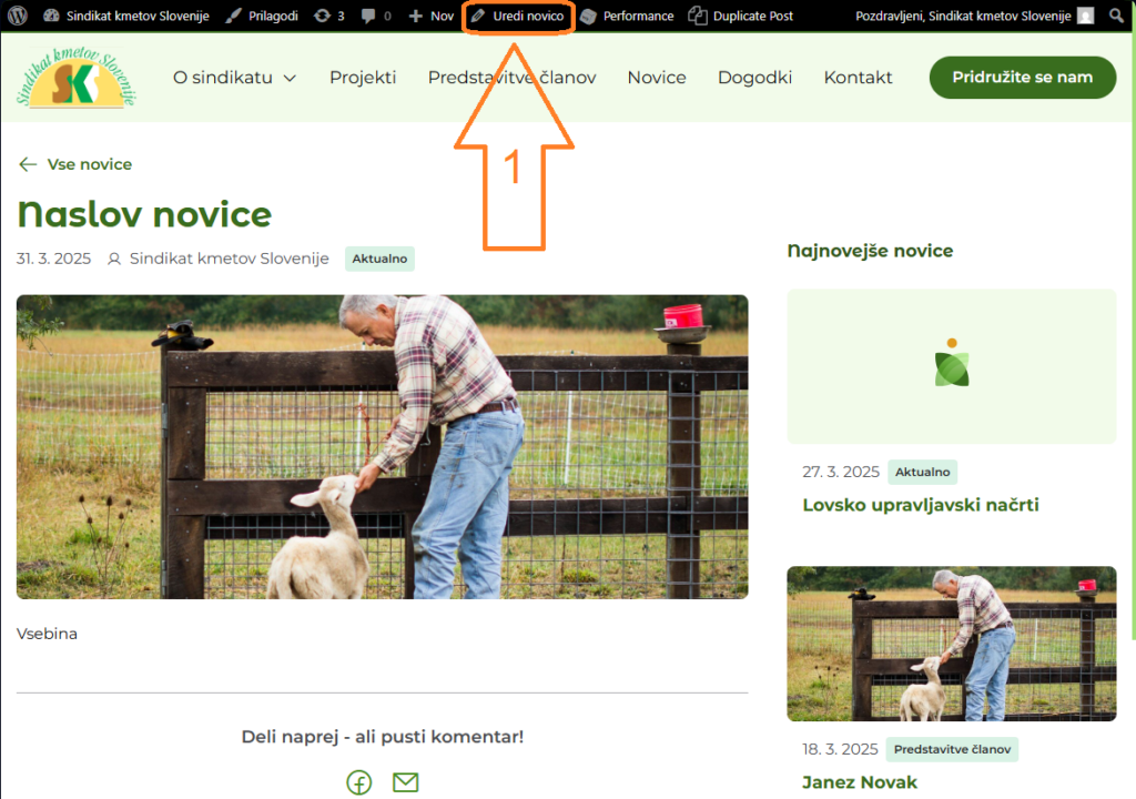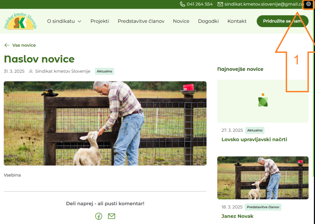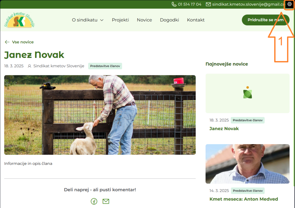 14. Prikaže se pravkar objavljena novica. Če bi jo želeli dodatno urejati to storite s klikom na gumb v obliki zobnika v desnem zgornjem kotu (1).