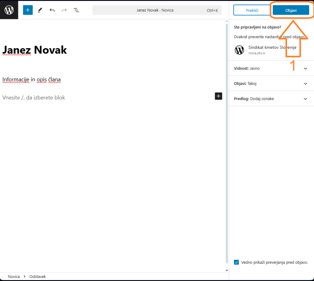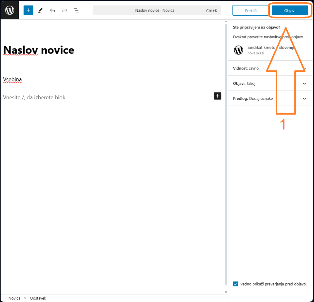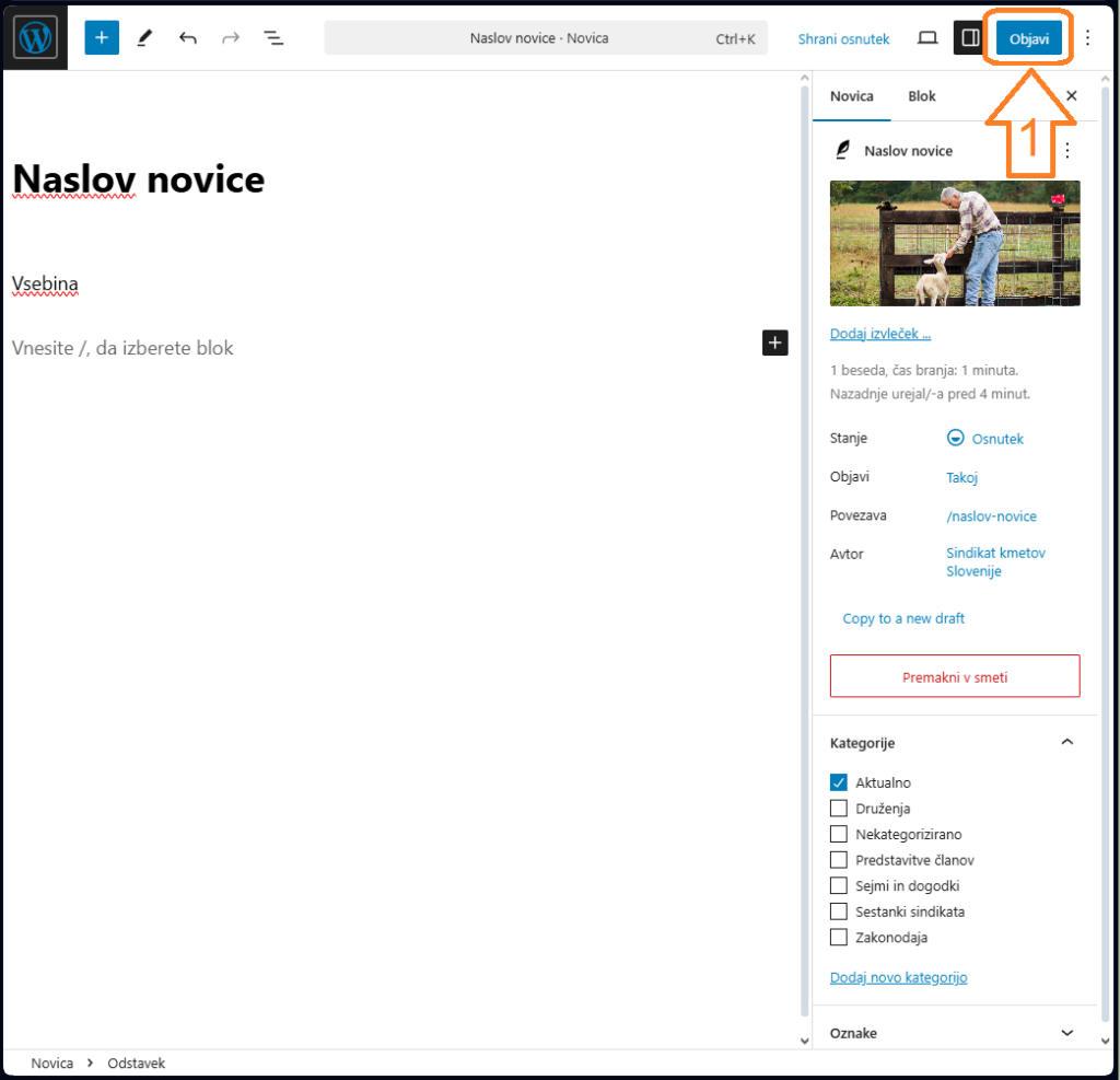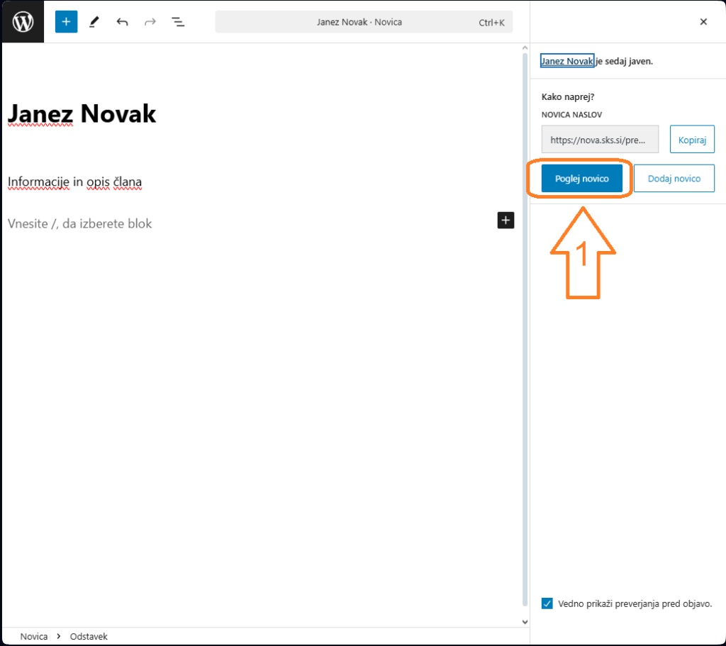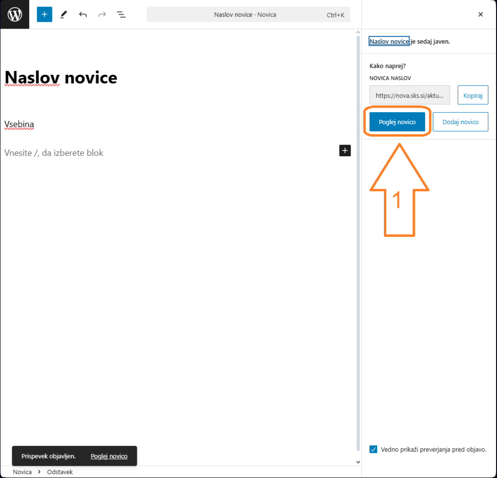 13. Novica je zdaj objavljena. Lahko si jo ogledate s klikom na gumb Poglej novico (1).