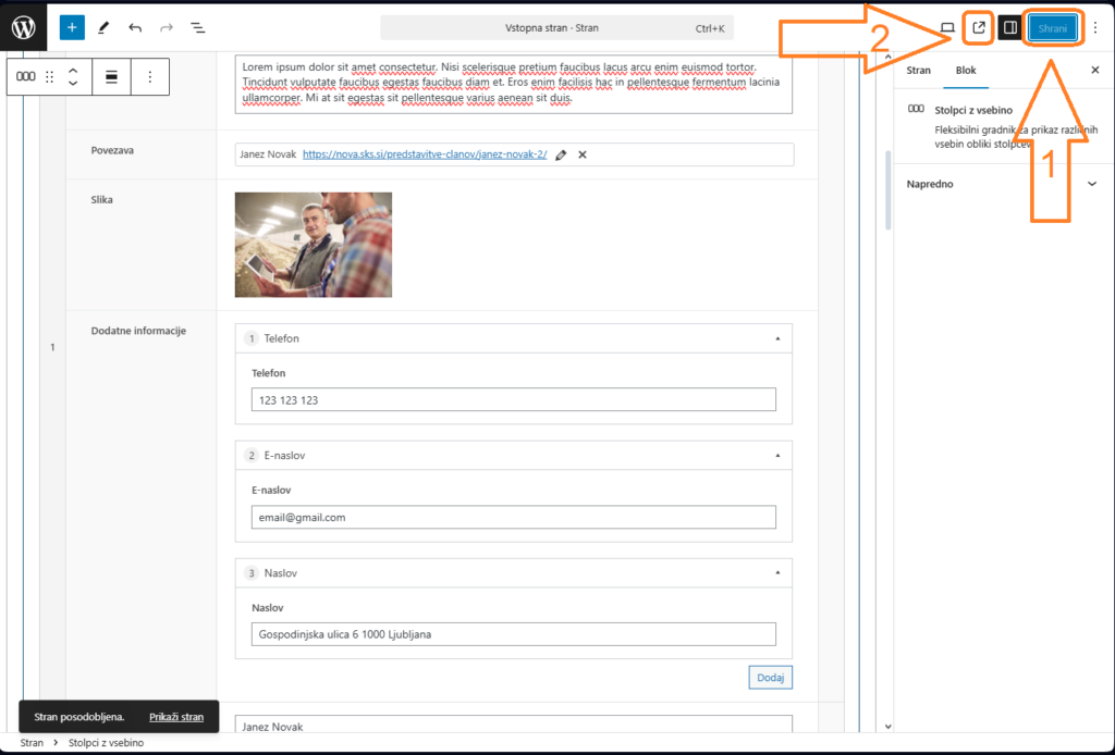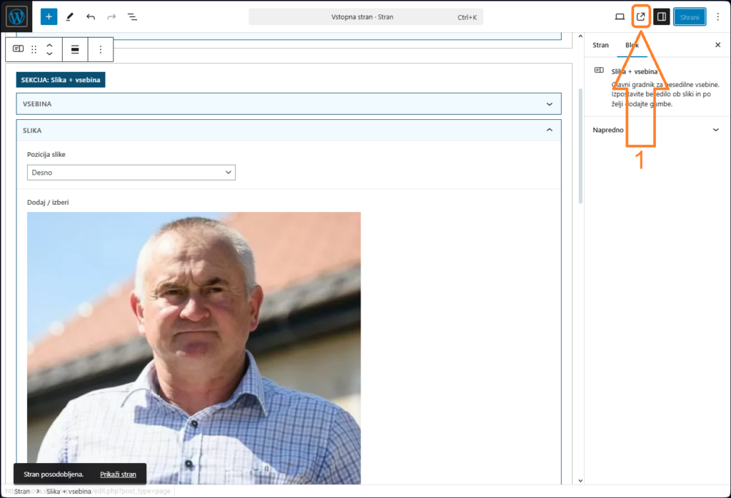 18. Ko zaključite urejanje kliknite gumb Shrani (1) v desnem zgornjem kotu. Kliknite na gumb za prikaz strani (2). Stran se vam odpre v novem zavihku.
