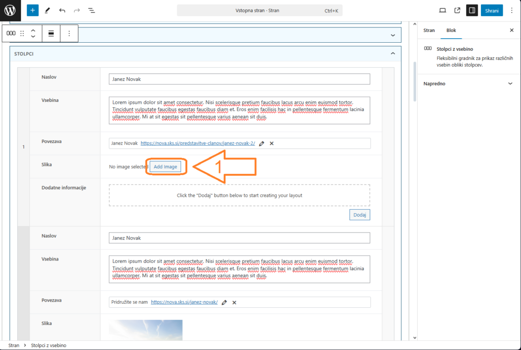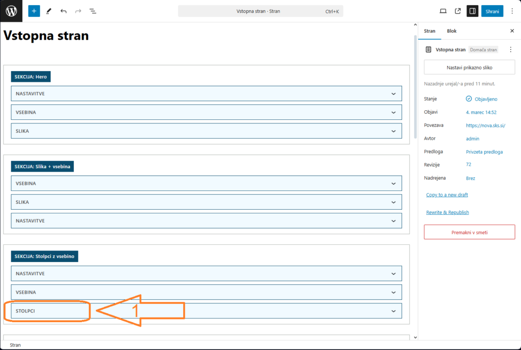 7. Prikaže se urejevalnik vsebine za Vstopno stran. V sekciji Stolpci z vsebino kliknite na gumb Stolpci (1).