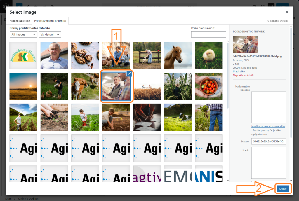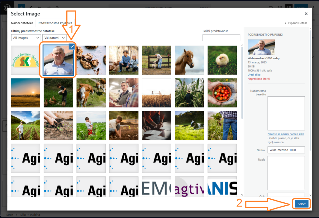 12. V predstavnostni knjižnici izberite ustrezno sliko (1) in kliknite gumb Select (2).