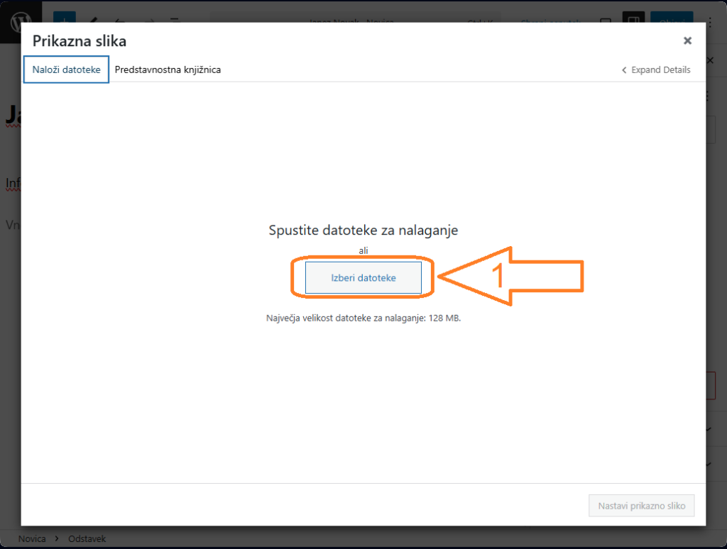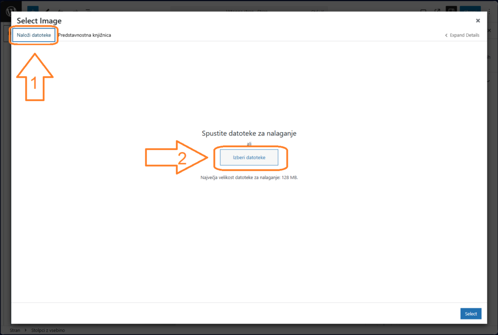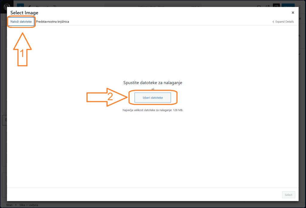 13. Če slike še niste predhodno naložili na spletno stran potem izberite zavihek Naloži datoteke (1) in nato Izberi datoteke (2). V računalniku nato poiščite in izberite sliko, ki jo želite uporabiti.