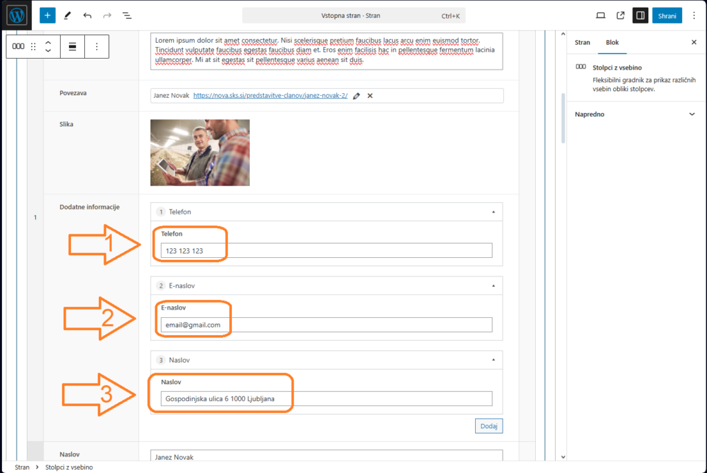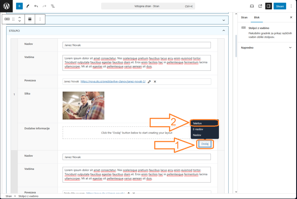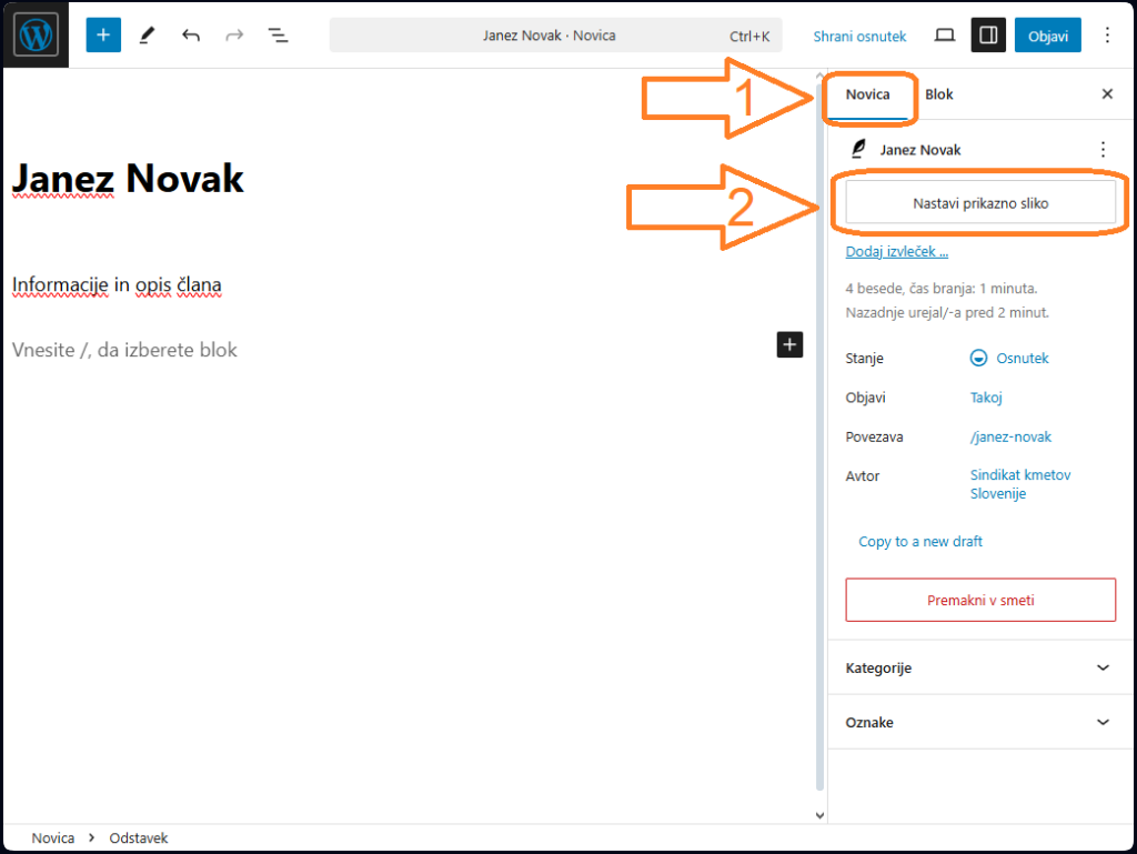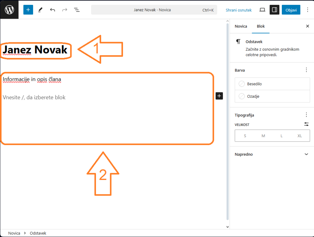 6. Vnesite poljubni naslov novice (1). V primeru da vnašate novega člana lahko vnesete ime in priimek člana. Nato vnesite informacije in opis člana v okno za urejanje vsebine (2).