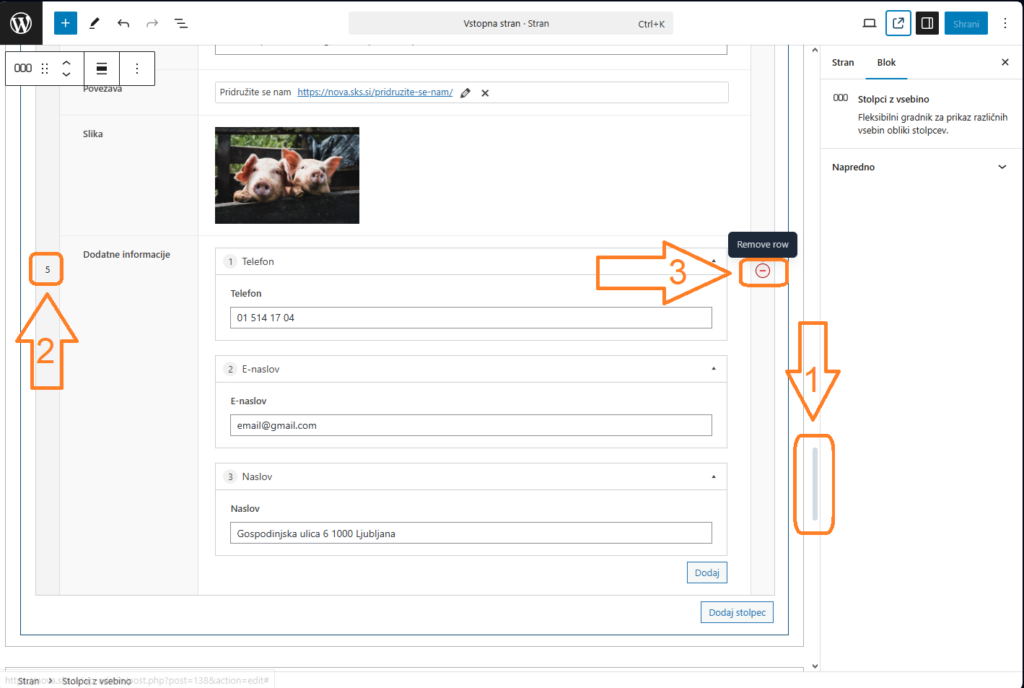 16. Prikaz spletne strani je optimiziran za največ 4 stolpce, tako da je treba zdaj stolpec št. 5 izbrisati. Z drsnikom (1) se pomaknite navzdol po urejevalniku dokler ne pridete do stolpca št. 5 (2). Kliknite na gumb Remove row (3).