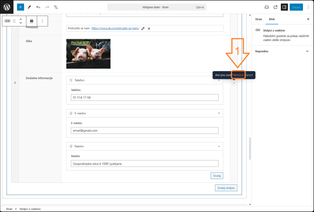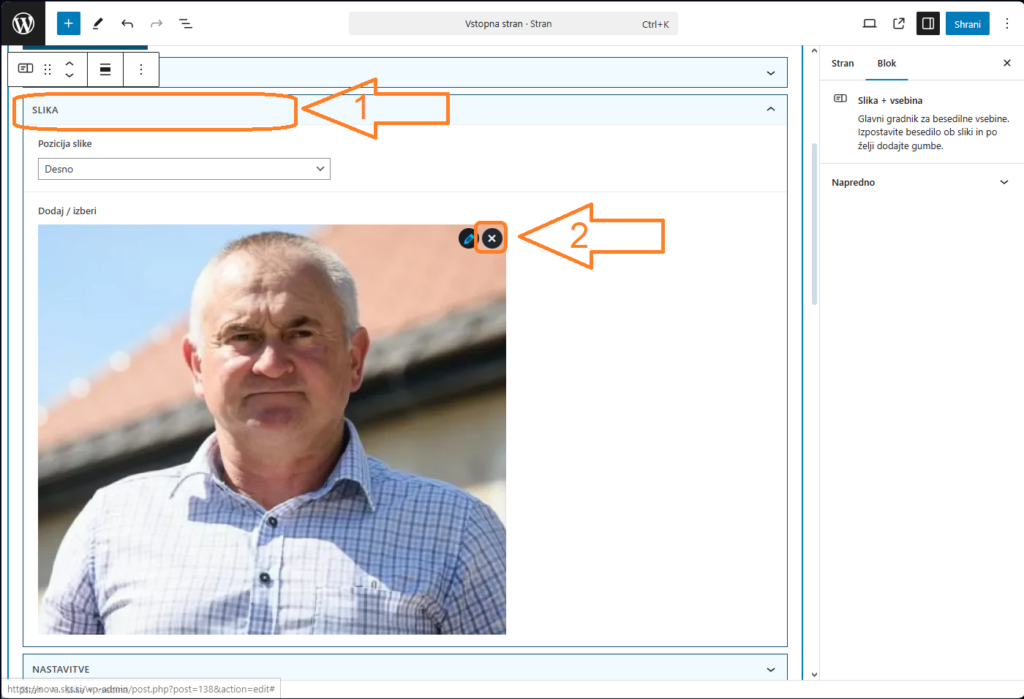 10. V sekciji Slika + vsebina kliknite na gumb Slika (1) in odstranite obstoječo sliko s klikom na gumb v obliki križca (2).
