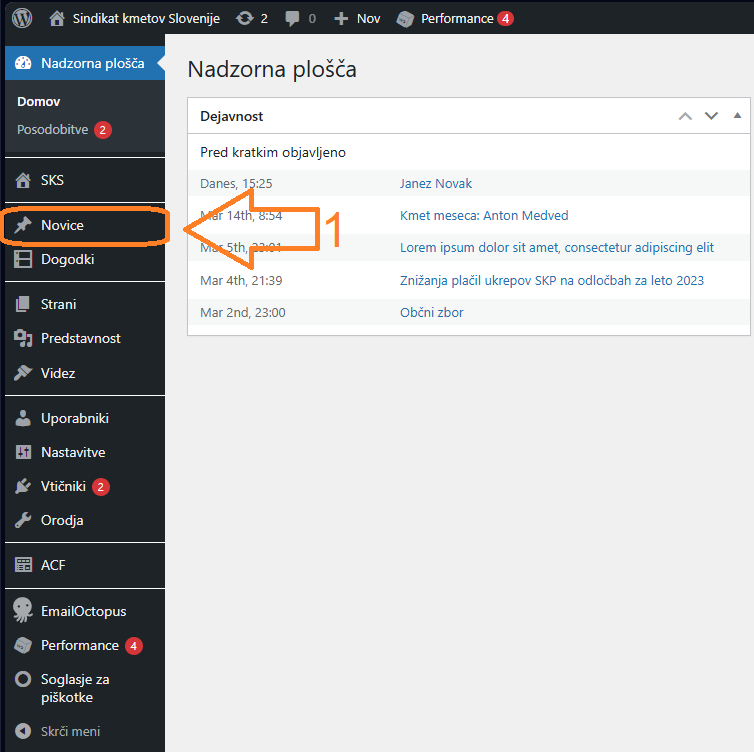 4. Odpre se vam nadzorna plošča za urejanje spletne strani. V levi orodni vrstici kliknete gumb Novice (1).