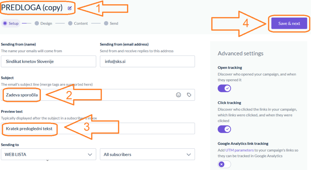 3. Preimenujete skopirano predlogo (1), spremenite Subject oz. Zadevo novice (2), po želji vnesete kratek predogledni tekst (3) in kliknete gumb Save & next (4). Ostala polja ni treba spreminjati.