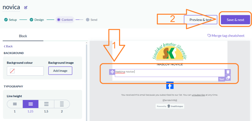 4. Vnesite naslov in vsebino novice v vnosno polje (1) in kliknite gumb Save & next (2). Glava in noga novice sta že oblikovani iz obstoječe predloge.