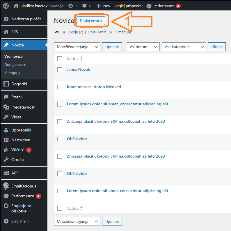 5. Odpre se seznam vseh novic. Za dodajanje nove kliknite gumb Dodaj novico (1).