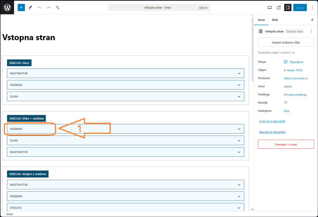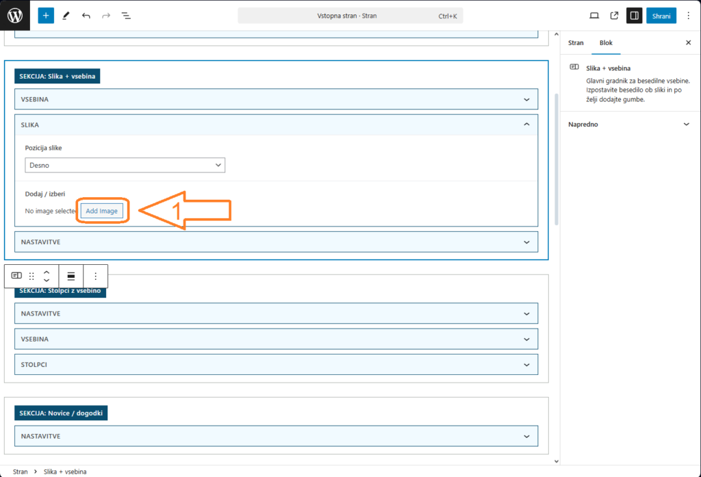 7. Prikaže se urejevalnik vsebine za Vstopno stran. V sekciji Slika + vsebina kliknite na gumb Vsebina (1).