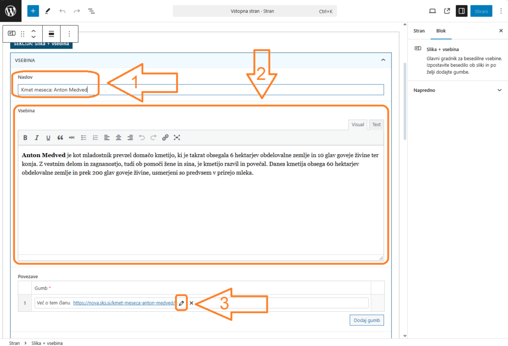 8. Vnesite Naslov (1) in Vsebino (2), nato kliknite gumb za urejanje povezave (3).