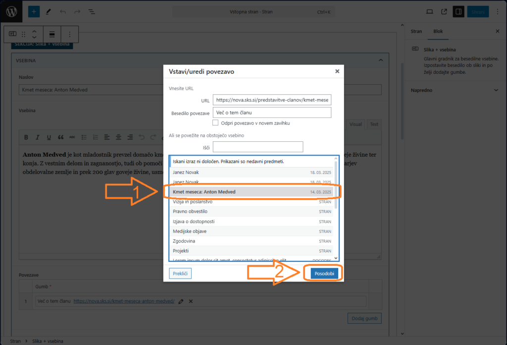 10. Na seznamu izberite povezavo do člana (1) v kolikor ste predhodno ustvarili novico o tem članu v kategoriji “predstavitve članov”, in kiknite gumb Dodaj povezavo (2).