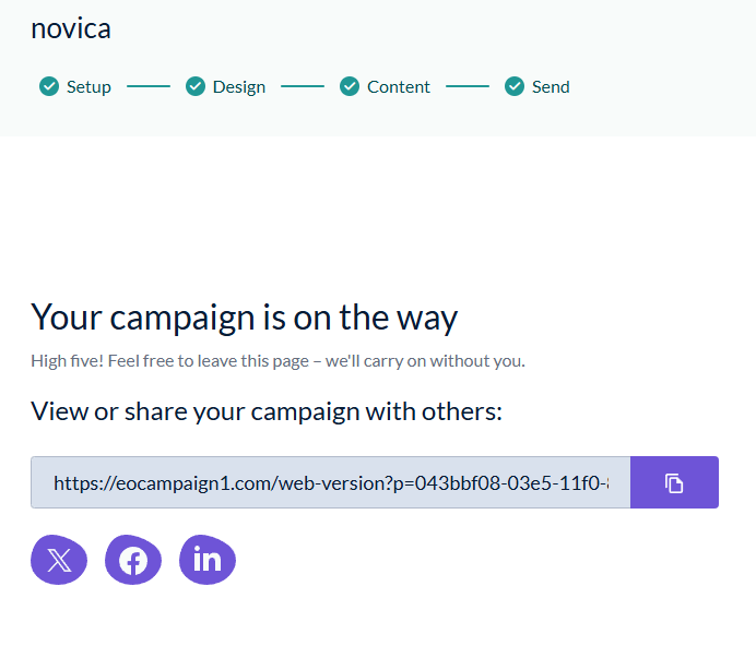 7. S tem ste uspešno zaključili postopek pošiljanje novice. Lahko zaprete platformo emailoctopus. Novice bodo dostavljene postopoma in lahko pristanejo tudi v mapi neželjena pošta ali promocije (recimo v gmailu).