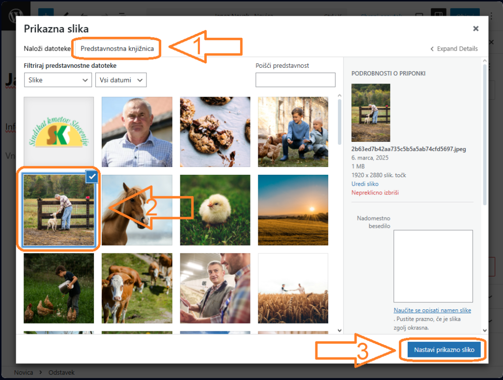 9. Lahko izbirate tudi iz že naloženih slik s klikom na gumb Predstavnostna knjižnica (1) in izberete sliko iz seznama (2). Ko izberete sliko kliknite gumb Nastavi prikazno sliko (3).