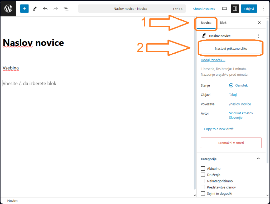7. V desni orodni vrstici izberite zavihek Novica (1) in nato kliknite gumb Nastavi prikazno sliko (2). Če prikazne slike nimate potem bo samodejno prikazana privzeta slika.