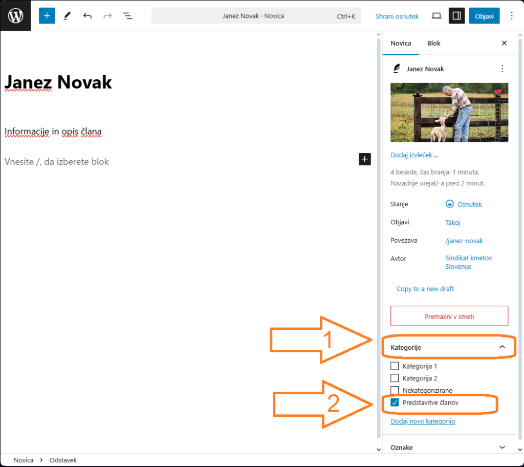 Postopek dodajanja novice o članu je v večji meri enak postopku dodajanja običajne novice, treba je samo izbrati ustrezno kategorijo.