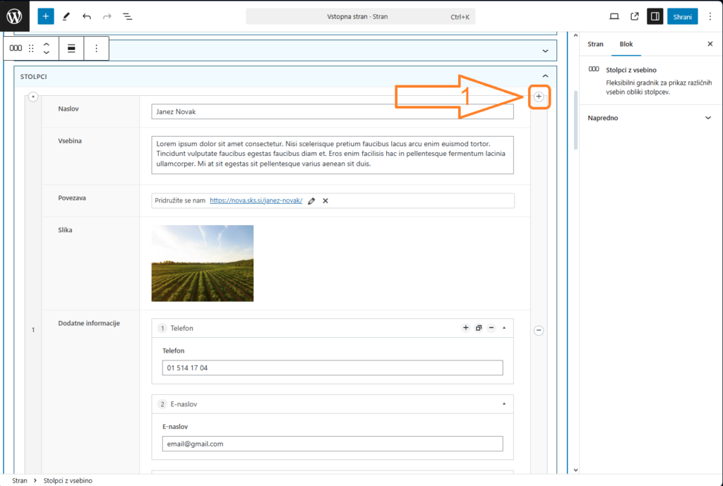 8. Za dodajanje stolpca kliknite na gumb + (1).