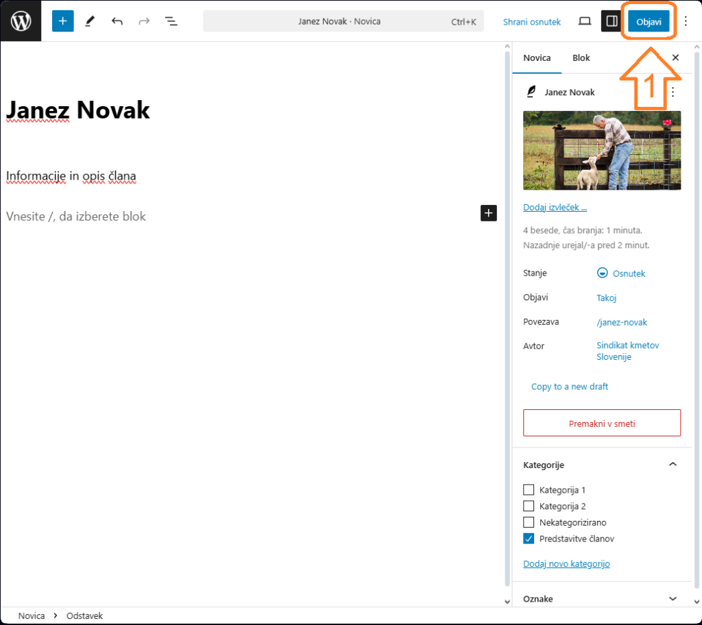 11. Ko zaključite z urejanjem kliknite gumb Objavi (1) v desnem zgornjem kotu.