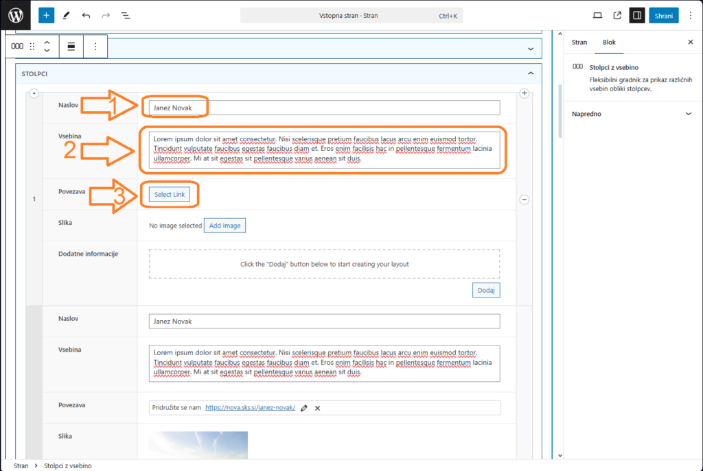 9. Vnesite naslov (1) in vsebino (2), nato kliknite gumb Select Link (3).
